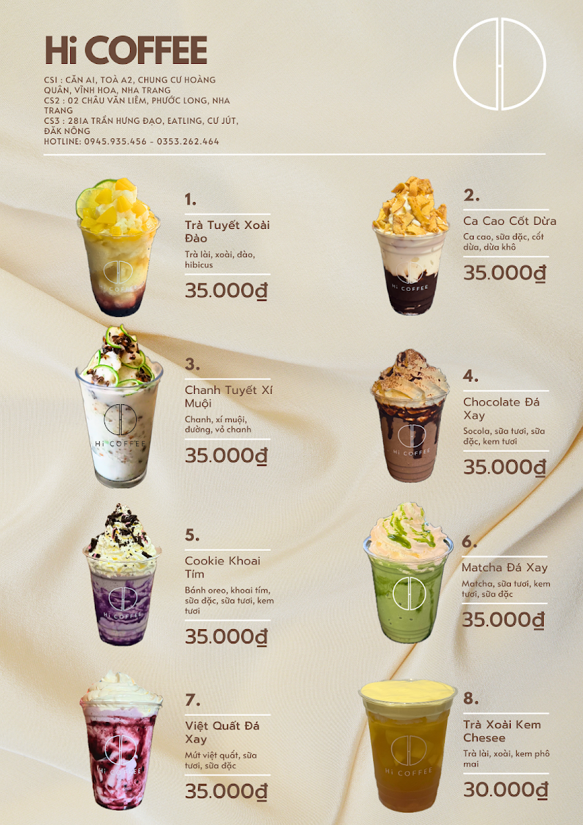 Located in the heart of Nha Trang, Hi Coffee is a hidden gem for coffee enthusiasts seeking quality brews at reasonable prices. The delightful menu features classic Vietnamese coffee with condensed milk for just 18k, alongside a refreshing Cold Brew priced at 25k. For something unique, the Dalgona coffee, served with sunflower seeds, is a must-try at 27k.